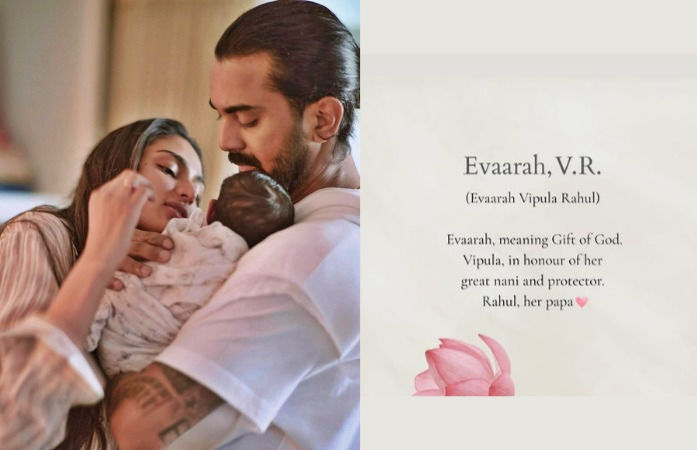 Star couple Athiya Shetty and KL Rahul have revealed that they have named their newborn daughter Evaarah, which means “Gift of God”.