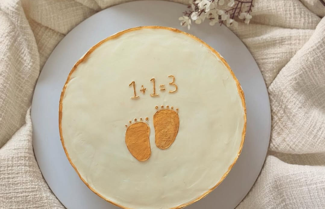 They shared an adorable picture of a round cake with the message “1 + 1 = 3” along with two small golden footprints beneath it. They also shared a video of them strolling through a park holding hands.