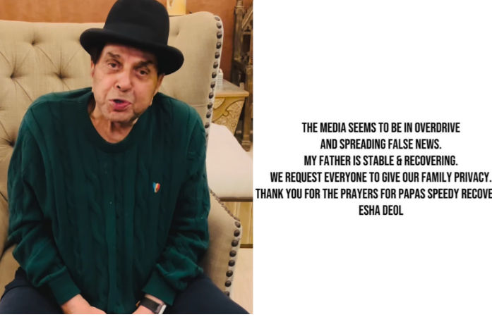 Daughter Esha Deol issued a firm note on Instagram on Tuesday morning saying, “The media seems to be in overdrive and spreading false news. My father is stable & recovering.