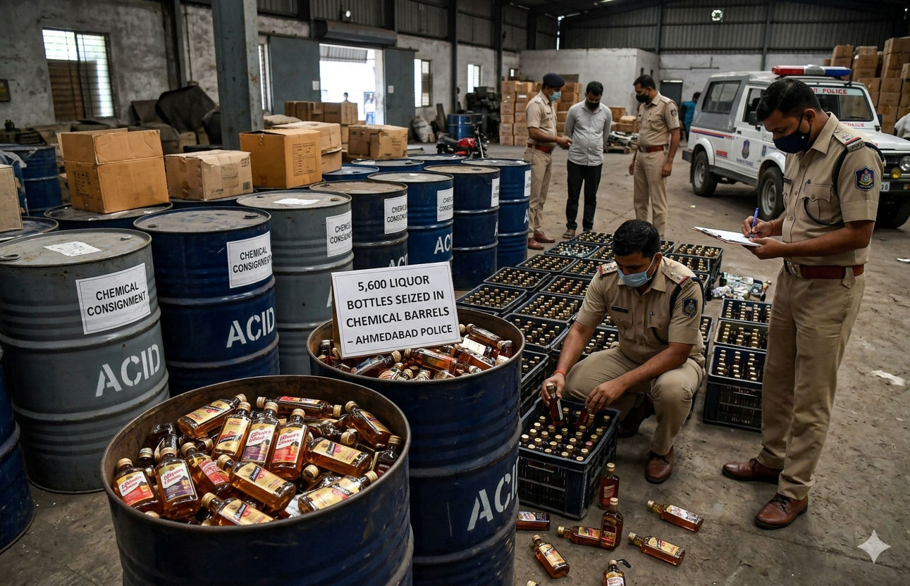 Police in Ahmedabad have seized 5,600 bottles of liquor concealed in chemical barrels and arrested a suspect, while a separate operation led to the recovery of another consignment of illicit alcohol.