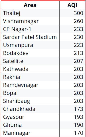 Ahmedabad’s air quality continued to deteriorate late on Thursday night, with the Air Quality Index (AQI) climbing to a worrying 212. Thaltej recorded the most polluted air in the city, touching an AQI level of 300.