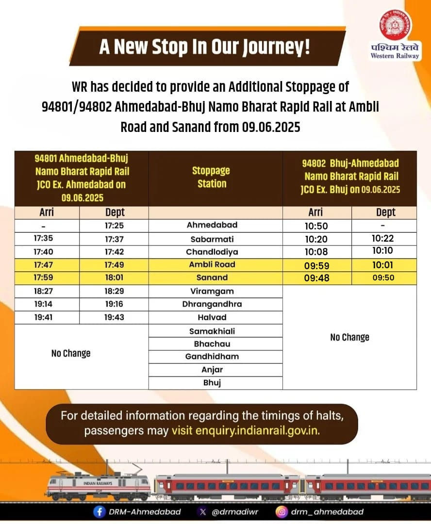 On the return trip from Bhuj to Ahmedabad, the train will arrive at Sanand at 9.48 am and leave at 9.50 am. It will then halt at Ambli Road at 9.59 am, departing at 10.01 am.