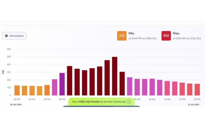 According to data from aqi.in, areas such as Chandkheda, Bopal, Shilaj, Narol, and Science City recorded AQI levels between 350 and 500 — categorised as “severe”.