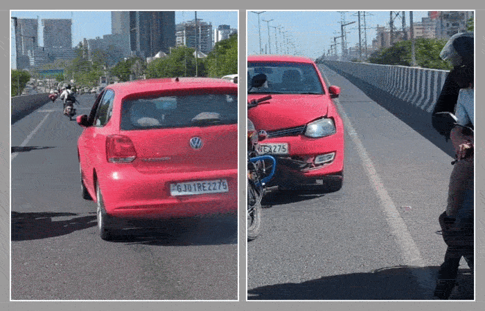 As seen in the video, 47-year-old Kamlesh Pankhaniya, a resident of Naroda, was passing over the Pakwan overbridge when a speeding Volkswagen Polo car coming from Thaltej towards Sarkhej hit his bike.