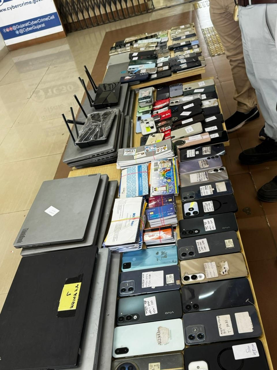 Seizures from this module include 15 laptops, 72 mobile phones, 126 SIM cards, 115 debit cards, multiple cheque books and passbooks, routers, pen drives and QR codes. A rental agreement was also recovered.
