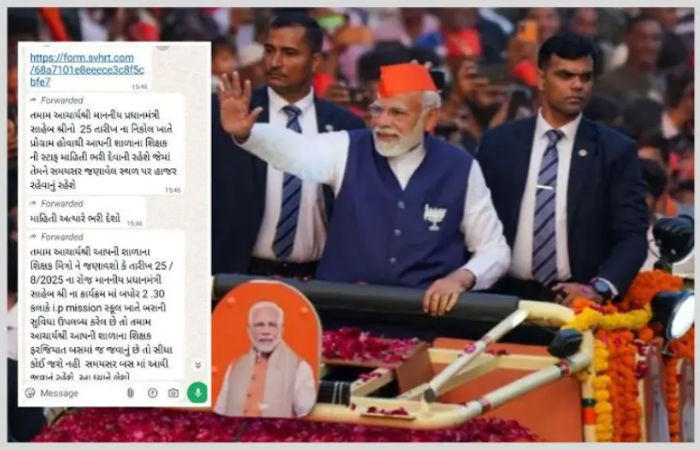 According to a message posted in a WhatsApp group of teachers, “All Principals, as the Honorable Prime Minister has a program at Nikol on the 25th, the staff information of the teachers of your school will have to be filled in, in which they will have to be present at the specified place on time. All Principals, please inform your school teachers that buses have been made available at IP Mission School at 2.30 pm for the program of the Honorable Prime Minister on 25/8/2025. Therefore, all Principals, teachers of your school have to go by bus, and not attend the rally directly. They will have to come by bus on time. Please take this into consideration.”