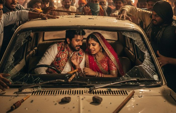 A 22-year-old man and his fiancée were brutally attacked by a mob in Ahmedabad after a late-night garba event on September 25. The couple was returning home from Navratri celebrations in Shela village when they were chased and their car vandalised. The mob followed them to a relative’s home, where they caused destruction.
