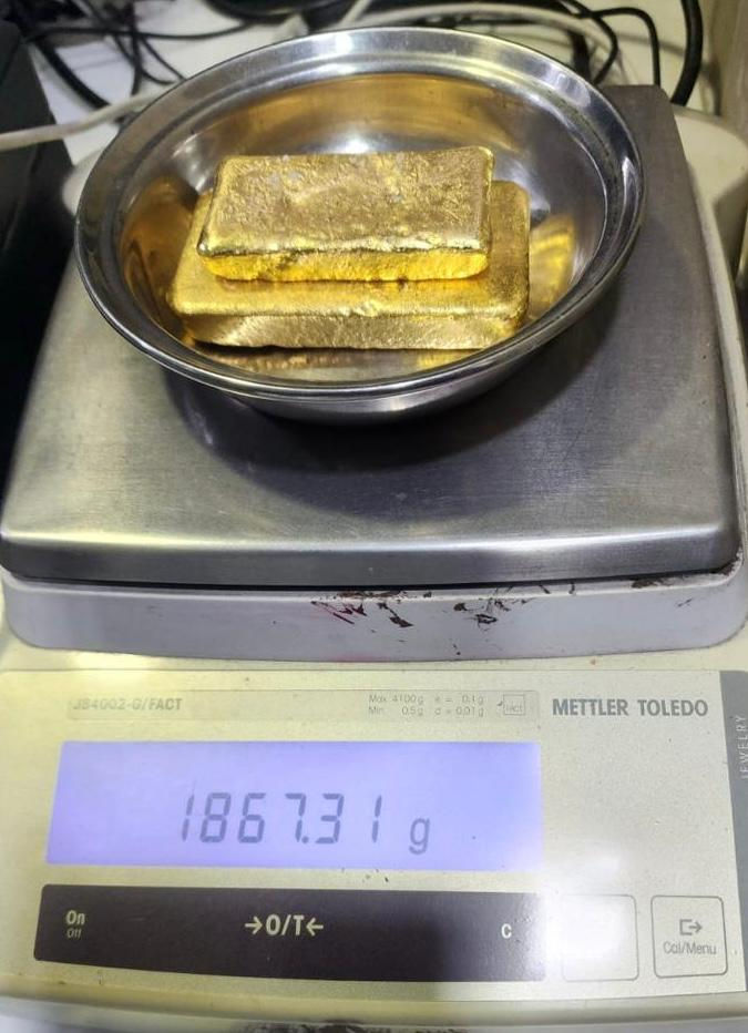 According to Customs officials, during a routine search of Indigo flight 6E-1478, which had arrived from Dubai, AIU staff recovered two pouches suspected to contain gold paste concealed in the aircraft's toilet. The pouches together weighed 2,196.61 grams. After extraction, officers derived two gold bars weighing 1,867.31 grams of 24-karat purity.
