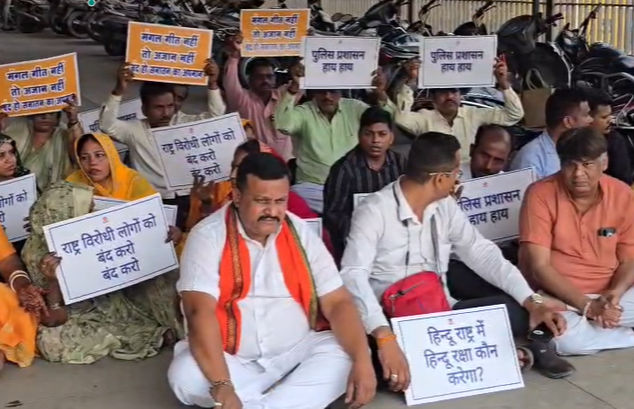 Protestors gathered at Shaherkotda Police Station carrying banners and raising slogans, calling for strict legal action. They accused members of the community of assault and deliberate disruption, alleging that the clash stemmed from objections to the DJ music during Ramzan.