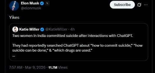 Elon Musk, the chief executive of Tesla and owner of X, has reacted to the recent suicide of two college students in a temple washroom in Surat, after police said the victims had searched for information about suicide methods using ChatGPT.