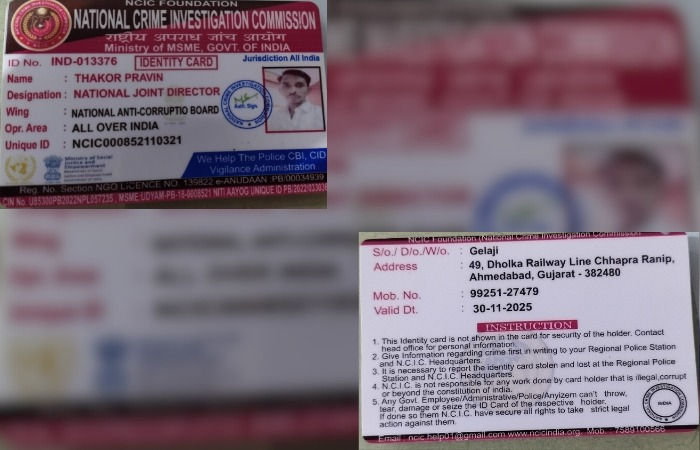 Their suspicious behaviour prompted police personnel to question them and examine their identification. The four individuals — Jayesh Pravinchandra Gajjar, Utsav Vishnubhai Panchal, Pritamsingh Ramdas Prajapati, and Pravinbhai Gelaji Thakor — all presented ID cards bearing government-style designations such as “National Joint Director”, “National Director”, and “National Vice President”. Their cards falsely claimed affiliation with the Ministry of MSME, Government of India, and prominently displayed the Ashoka Pillar, giving the impression of official status.