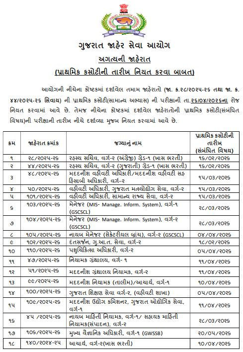 As per the details released by GPSC, preliminary examinations for 18 different Class I and Class II cadres will be conducted between February and April 2026.