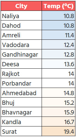 Mount Abu recorded the season’s lowest at 0°C. Meteorologists attribute Gujarat’s increased cold to a sustained flow of northern winds.