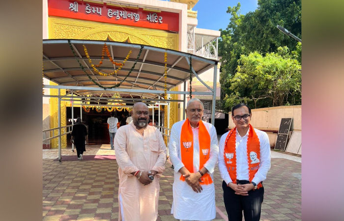 The newly elected state president of Bharatiya Janata Party, Vishwakarma, arrived at the BJP state headquarters, Kamalam, in Gandhinagar at 9.30 am on Saturday after paying respects at Ahmedabad's Camp Hanuman Temple along with Ahmedabad city BJP president Prerak Shah.