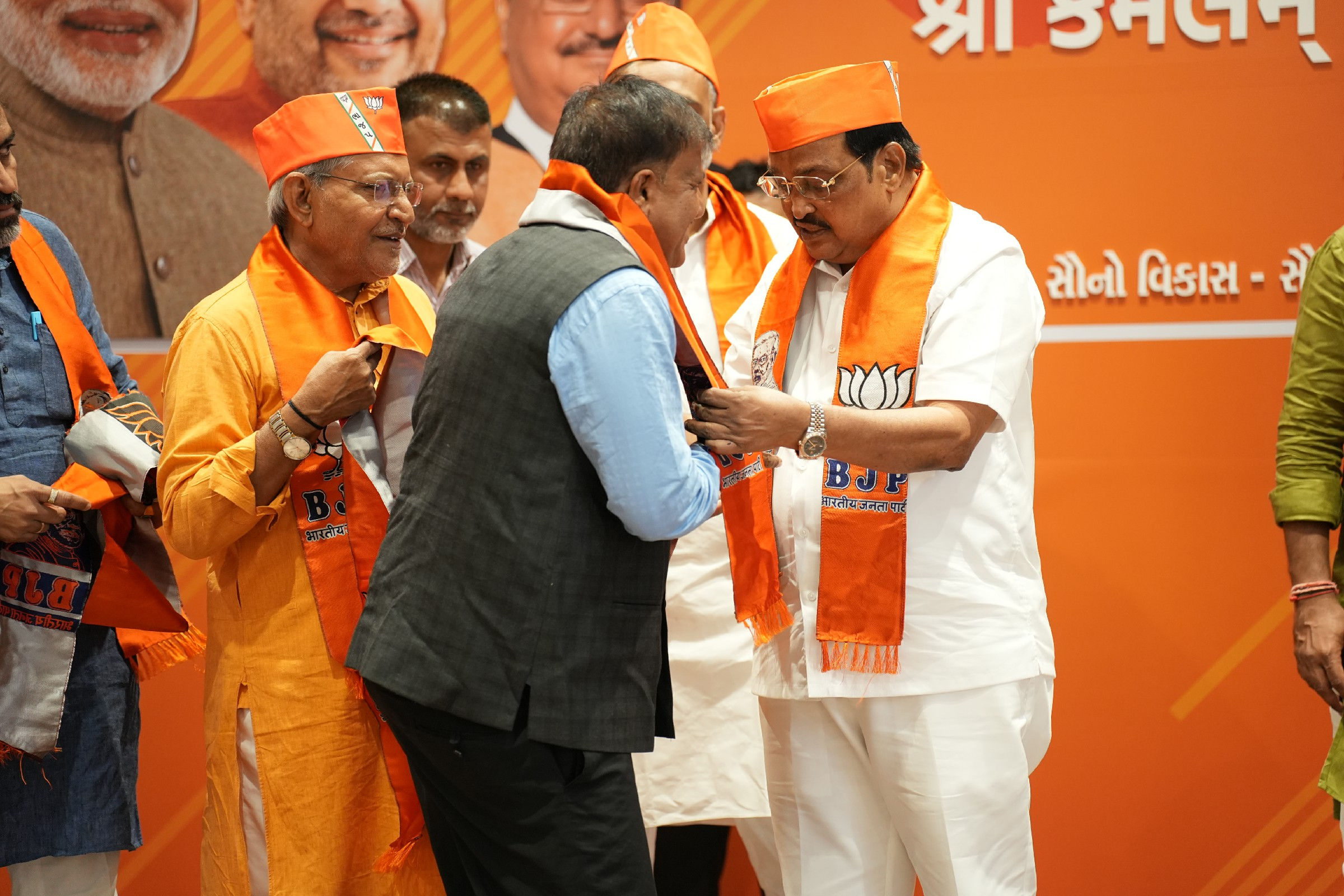 Mukesh Patel, the state secretary of AAP, deputy state leader JJ Mevada, and former Assembly candidate Dinesh Kapadia formally joined the BJP at a ceremony in the presence of Gujarat BJP chief CR Patil on Mar 18.