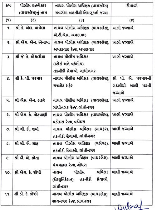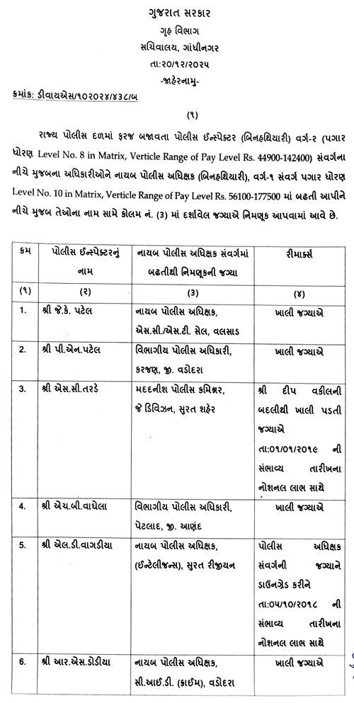 According to the orders issued by the state Home Department, promotions have been granted to armed, unarmed and wireless Police Inspectors serving across various districts of Gujarat.