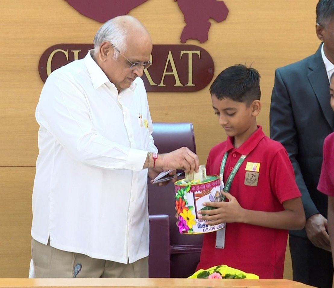 Children from St. Xavier’s School and the School of Achievers in Gandhinagar visited the Chief Minister’s residence to offer their contributions to the Teachers’ Welfare Fund.