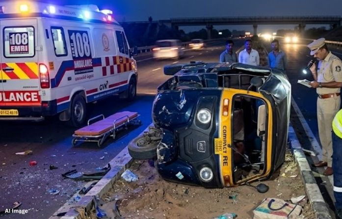 A tragic accident occurred early Saturday morning on the Bavla–Bagodara highway in Ahmedabad, where a passenger rickshaw overturned near the Kerala Bridge, resulting in the death of the driver.