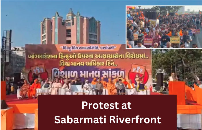 The Riverfront echoed with slogans demanding an end to the atrocities in Bangladesh. The event was attended by prominent figures including Mahant Das of the Ahmedabad Jagannath Temple, saints from the Swaminarayan sect, BJP legislators, and party workers.