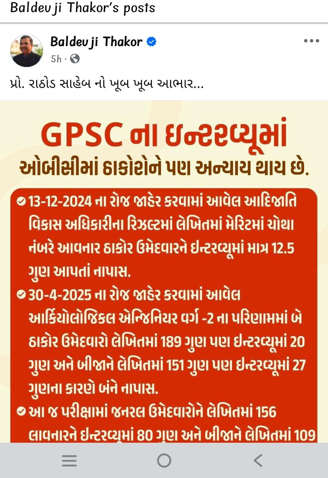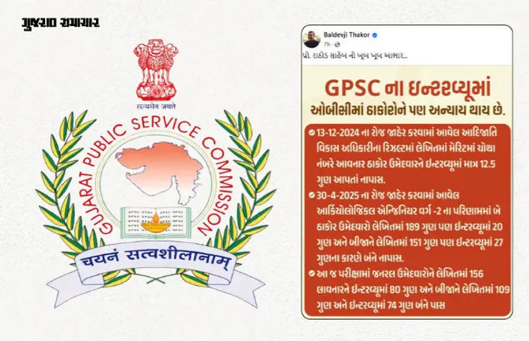 Thakor community leader and former Kalol MLA Baldevji Thakor also shared a post on social media claiming that Thakor candidates in OBC category are also being treated unfairly in GPSC interviews.