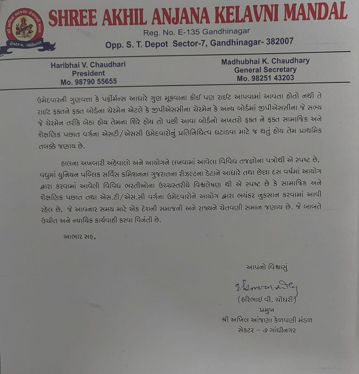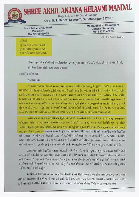 A letter was written by the Anjana Chaudhary community to the Chief Minister of Gujarat claiming injustice by the Gujarat Public Service Commission (GPSC).