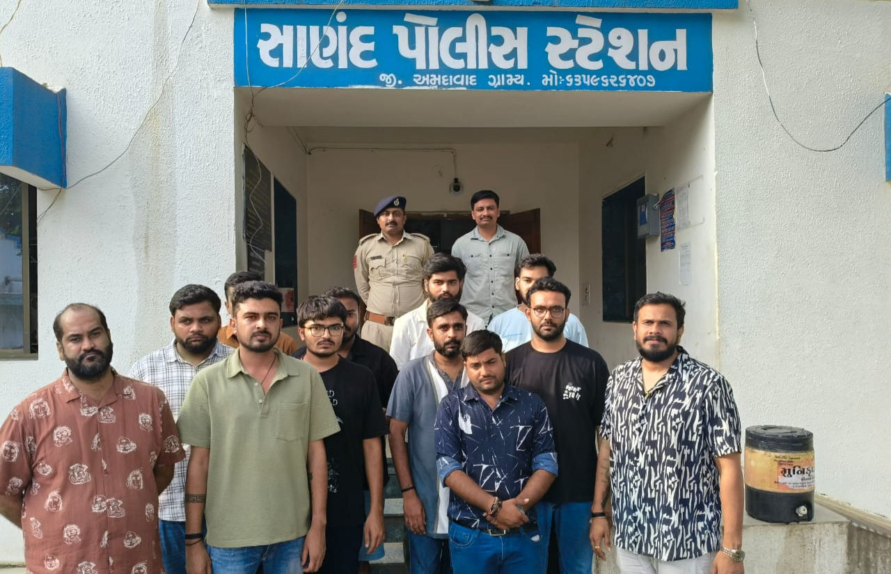 According to police, the accused were found consuming alcohol in violation of Gujarat's prohibition laws. A glass bottle of Indian-made foreign liquor was seized along with 11 mobile phones from the premises. Sanand police have registered an offence under relevant sections of the Gujarat Prohibition Act, and further investigation is underway.