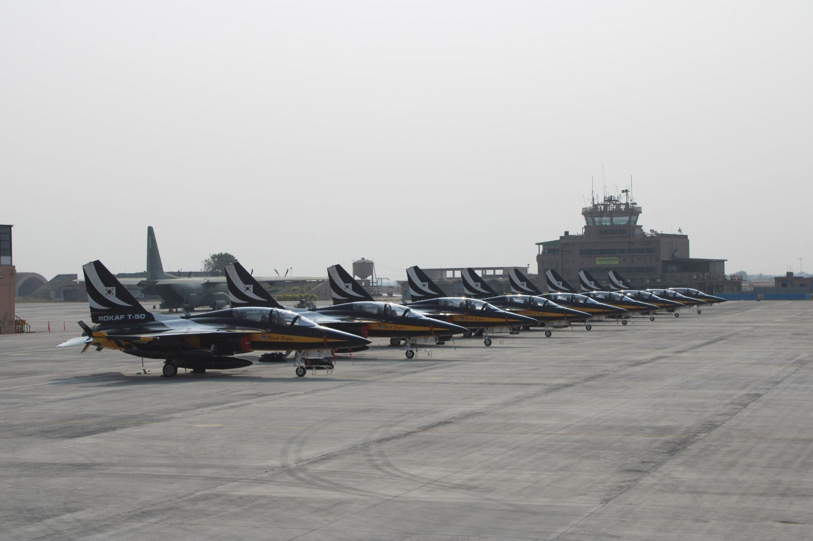 Fighter aircraft from the South Korean Air Force’s renowned aerobatic team, the Black Eagles, made a transit halt at the Jamnagar Air Force Station as part of their journey to Saudi Arabia. A total of nine T-50 Golden Eagle fighter jets, accompanied by a C-130 transport aircraft, landed at the base for rest, refuelling and technical checks.