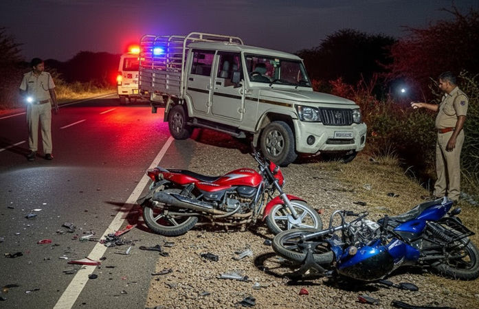 A major accident near Kesariya village in Una taluka of Gujarat claimed the lives of three people, including two brothers, after a speeding Bolero jeep crashed into two motorcycles on Tuesday night. A 17-year-old girl suffered serious injuries.