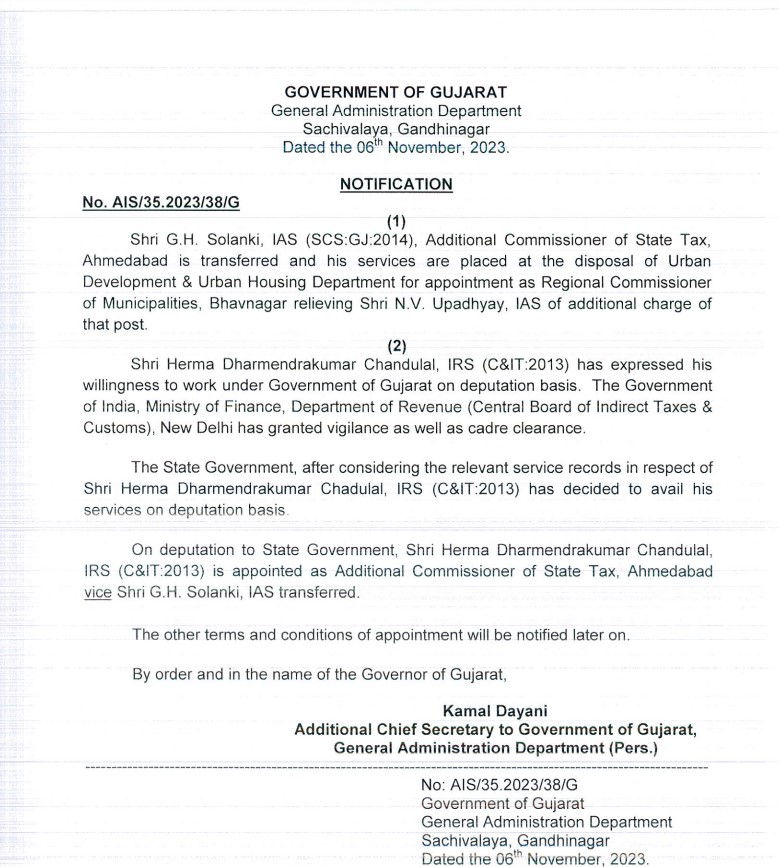 IAS GH Solanki, additional commissioner of state tax at Ahmedabad, was transferred and allotted the urban development and urban housing department for the post of regional commissioner of municipalities in Bhavnagar.