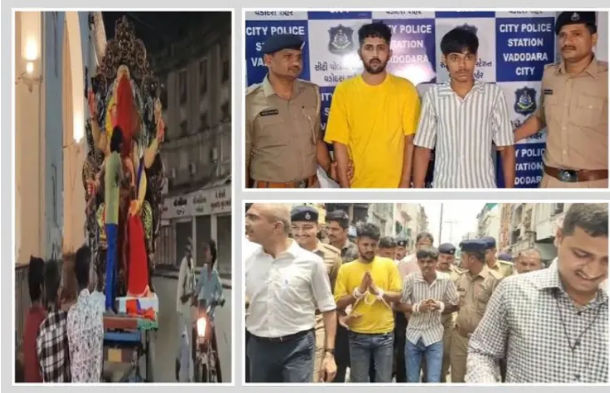 Vadodara police on Wednesday arrested two youths for allegedly throwing eggs at a Ganesh idol during preparations at the Manjalpur Ganesh Mandal. The incident occurred around 2.30 am in the Panigate Madar Market area, where the idol was about to be installed.