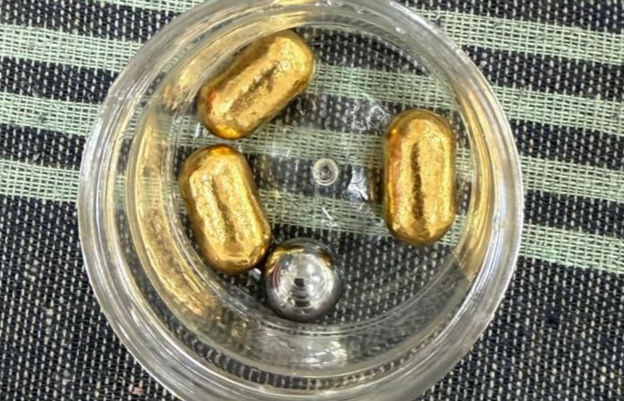 Upon examination by a government valuer, it was found that three yellow cylindrical capsules contained 24-carat pure gold weighing a total of 135.200 grams. The fourth object was found to be an iron pellet. The market value of the seized gold has been estimated at approximately ₹21,89,564.
