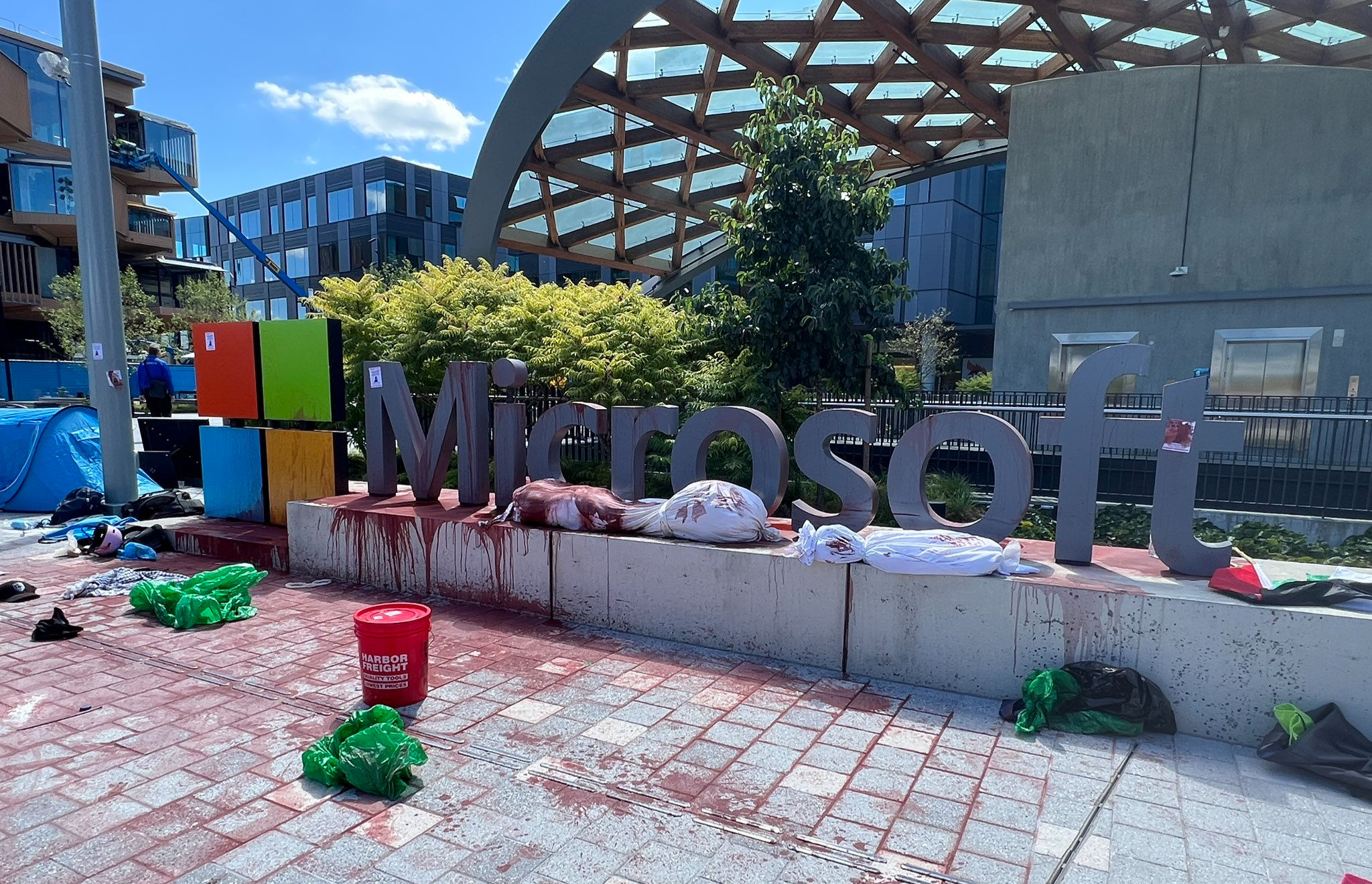 Microsoft, in a statement reported by Bloomberg, said: “Today, the group returned and engaged in vandalism and property damage. They also disrupted, harassed, and took tables and tents from local small businesses at a lunchtime farmer’s market for employees.”