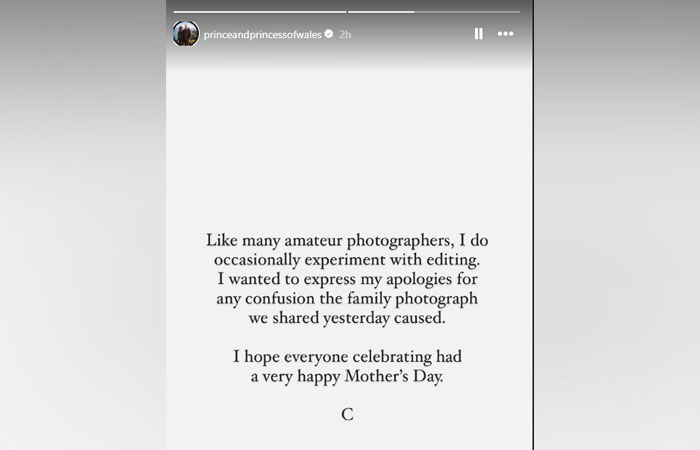 “I wanted to express my apologies for any confusion the family photograph we shared yesterday caused. I hope everyone celebrating had a very happy Mother’s Day,” wrote Kate in her story. The message was indicated as a quote of “C,” which came directly from Catherine.