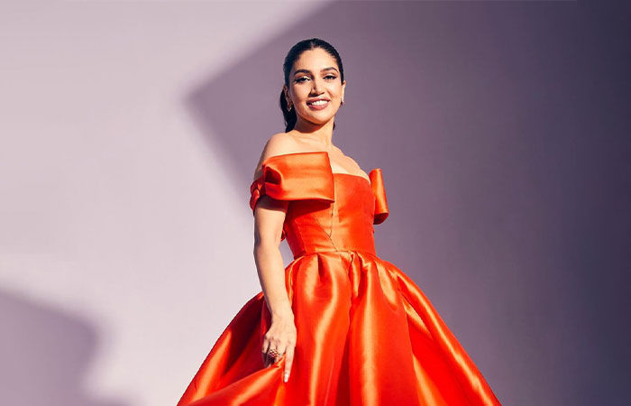 Bhumi shells Barbie feels in this bright red off-shoulder midi dress, featuring rainbow sleeves that are worth the spotlight. The actress simply accessorised her look with studs, rings and a soft-glam makeup. She tied her hair in a ponytail, and rounded off the look with pink heels.