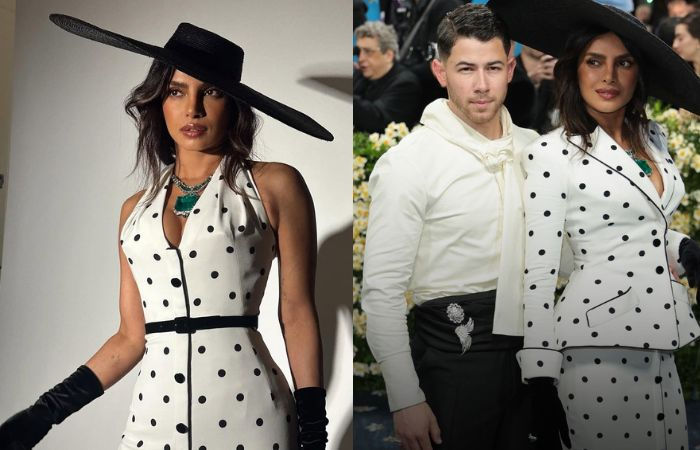 Priyanka took to Instagram, where she shared her look for the event dressed by Olivier Rousteing of luxury fashion house Balmain for the 2025 theme "Superfine: Tailoring Black Style”. She wore a white halter-neck dress with black polka dots with a black belt at the waist and black buttons down the center. She completed her look with a big black wide-brim hat and emerald green neckpiece.