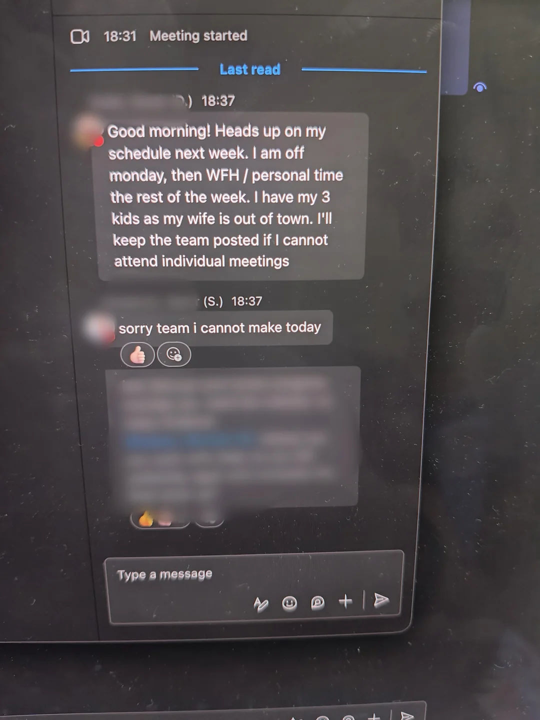 The screenshot read, “Good morning! Heads up on my schedule next week. I am off Monday, then WFH / personal time the rest of the week. I have my 3 kids as my wife is out of town. I’ll keep the team posted if I cannot attend individual meetings.”
