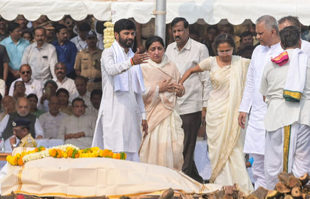 Earlier in the day, his mortal remains were kept at his residence in Katewadi, where a massive influx of people from across the state arrived to pay their respects.