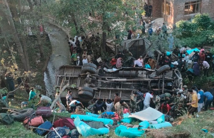 The bus that was transporting 36 jawans posted on election duty met with the accident near Brel village of Waterhail in Budgam district, causing the bus to crumple completely.