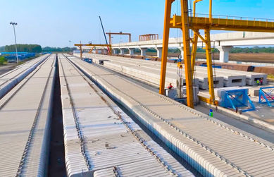 Precast slabs are lifted onto the viaduct and transported using a Track Slab Laying Car (SLC), which can carry and position up to five slabs at a time on the RC track bed.