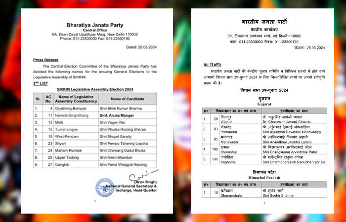 As the Lok Sabha elections are just a month away, the BJP (Bharatiya Janata Party) has released the second list of candidates for the Sikkim legislative assembly and the list of four states’ bye elections.
