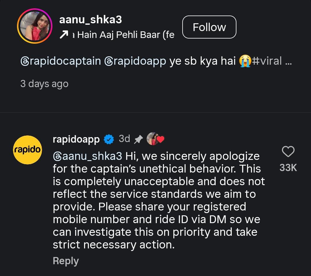 The company replied by saying, “Hi, we sincerely apologise for the captain’s unethical behavior. This is completely unacceptable and does not reflect the service standards we aim to provide. Please share your registered mobile number and ride ID via DM so we can investigate this on priority and take strict necessary action.”