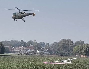 A local eyewitness described the incident, saying, “Around 12.15 pm, we heard a loud noise while we were at our homes and came out to see what had happened. When we reached the spot, we saw two people, including an elderly man. They had been flying an aircraft which had fallen into the pond behind us. All of us together pulled them out and rescued them.”