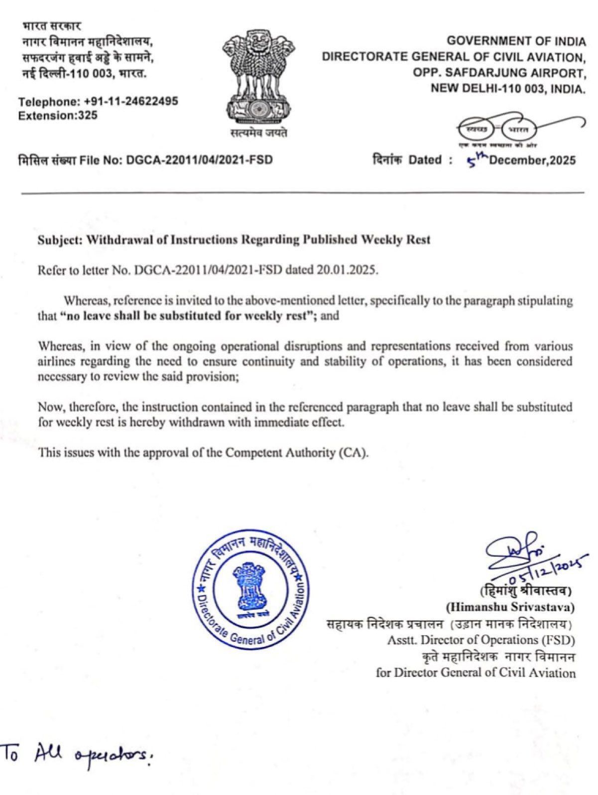 Referring to its earlier order of “no leave shall be substituted for weekly rest”, the DGCA said that “In view of the ongoing operational disruptions and representations received from various airlines regarding the need to ensure continuity and stability of operations, it has been considered necessary to review the said provision”.