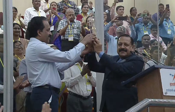 Dr Jitendra Singh, Minister of State for Science and Technology felicitated with a momento by ISRO chief S Somanath
