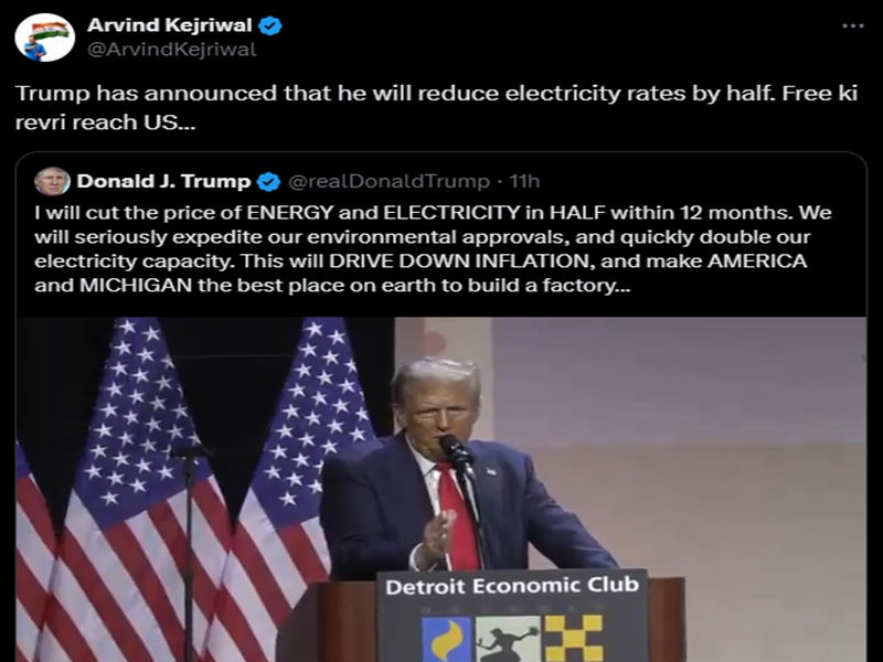 Former Delhi Chief Minister Arvind Kejriwal on Friday shared a video of Donald Trump, the Republican US Presidential candidate, highlighting his purported poll promise of slashing energy and electricity bills by half.