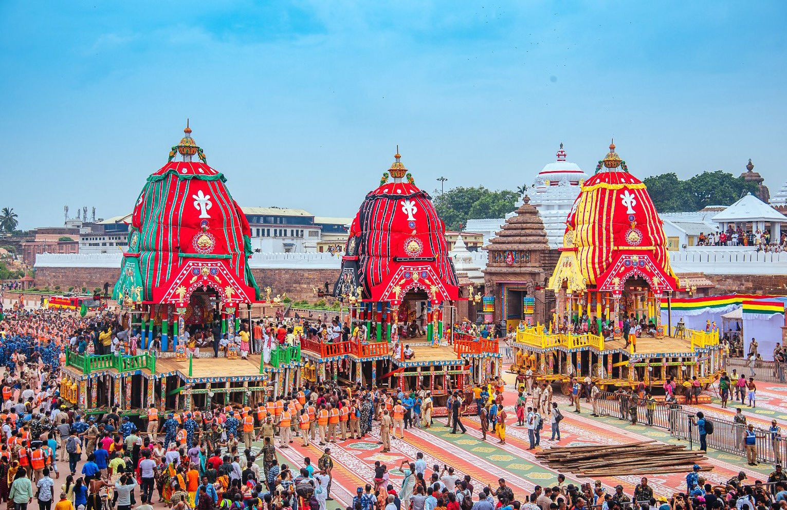 During the yatra, the holy triad (Lord Jagannath with siblings Balabhadra and Subhadra) seated in three grand chariots embarks on the annual nine-day sojourn to their birthplace, Gundicha Temple (the Yagnya Vedi or the Garden house of the Lord).
