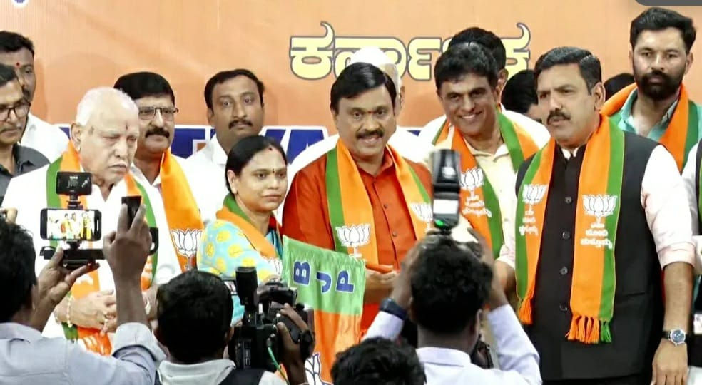 Vijayendra welcomed Janardhana Reddy into the BJP by handing over the BJP flag to him.