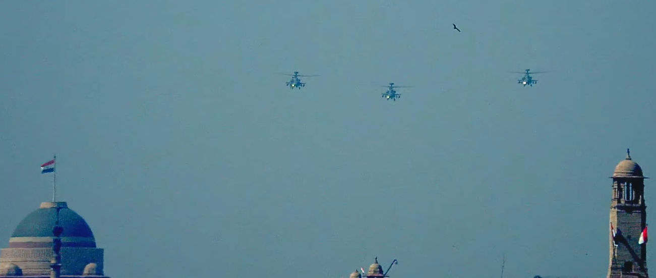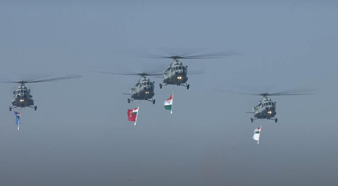 The Mi-17V-5 helicopters of the 129 Helicopter Unit from Rashtrapati Bhavan take flight towards Kartavya Path. Leading the formation is Group Captain Alok Ahlawat with the National Flag, followed by Wing Commander Shailender Singh with the Army Flag, Wing Commander Rohit Tiwary with the Navy Flag, and Wing Commander Vinay with the Air Force Flag. A floral shower is being released from the sky, marking the grand beginning of the Republic Day celebrations