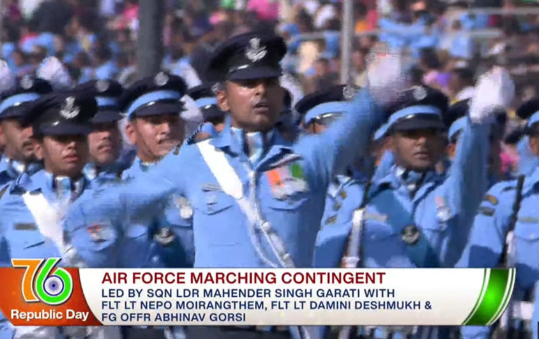 Air Force Marching Contingent marches with pride. Flt. Lt. Nepo Moirangthem from Manipur led the IAF marching contingent. The IAF marching contingent will be commanded by Squadron Leader Mahender Singh, with Flt. Lt. Damini Deshmukh, Flt. Lt. Nepo Moirangthem, and Flying Officer Abhinav Ghosh as supernumerary officers. The contingent will comprise four other officers and 144 Airmen.