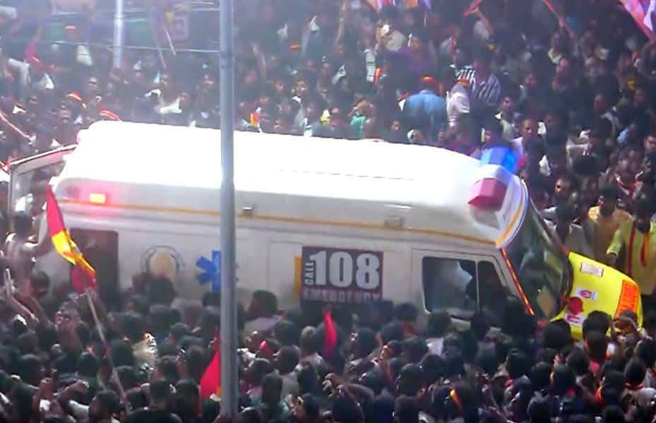 The stampede occurred when thousands gathered to hear Vijay speak at Velayuthampalayam after his Namakkal roadshow earlier the same day.